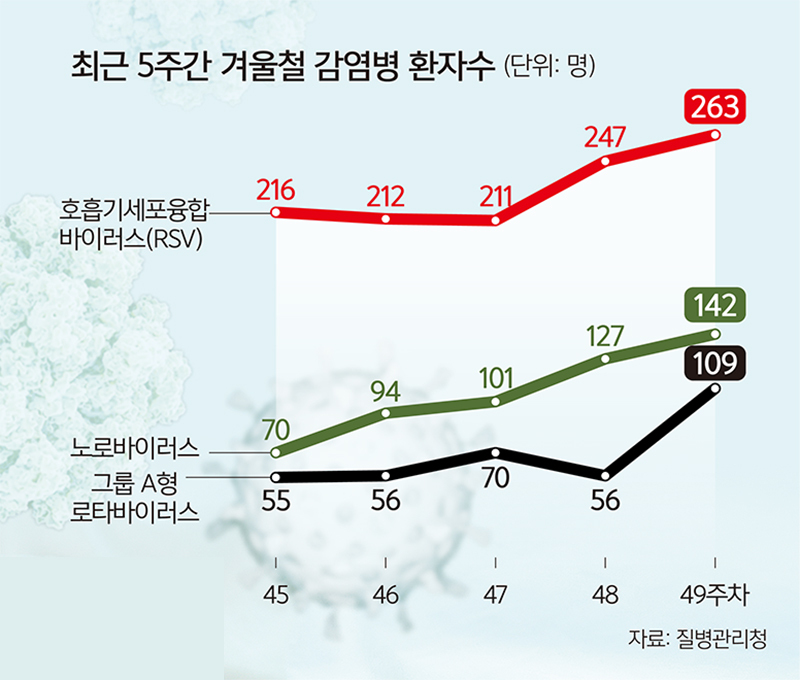 겨울철 영유아 장염의 또 다른 축은 로타바이러스다.14일 질병관리청에 따르면 올해 49주차(11월30일~12월6일) A형 로타바이러스 환자는 109명으로,전주 대비 94.6% 증가했다.