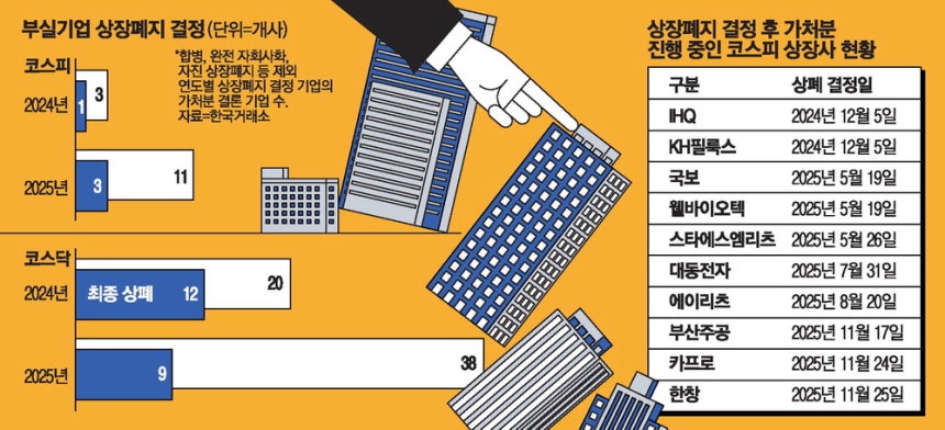 코스닥시장에서도 같은 흐름이 나타났다.지난해 20건이던 강제 상장폐지 건수는 올해 38건으로 두 배 가까이 증가했다.