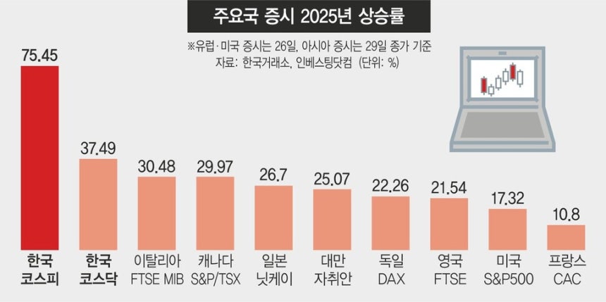 올해 증시 폐장일을 하루 앞둔 29일 코스피가 2.2% 오르며 4220을 넘어섰다.코스피는 올들어 이날까지 75.45% 올라 상승률이 세계 주요국 대표지수 가운데 압도적인 1위를 차지했다.