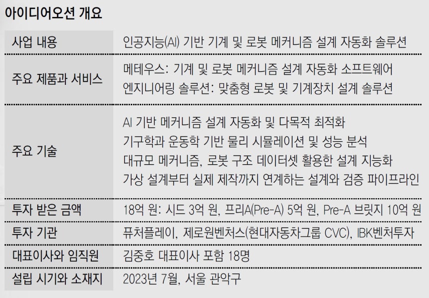 9일 서울 관악구 사무실에서 만난 김중호 아이디어오션 대표이사(32)는 메커니즘(기구) 설계 자동화 솔루션‘메테우스(METHEUS)’를 시연하며 이같이 말했다.2023년 7월 설립된 아이디어오션은 사람의 직관에 의존하던 메커니즘 설계를 수학 모델과 AI 기술로 자동화해 주목을 받고 있다.메커니즘은 로봇이나 기계 시스템 등에서 모터의 회전력을 특정한 움직임으로 바꿔 주는 뼈대(링크)와 관절(조인트) 구조를 말한다.