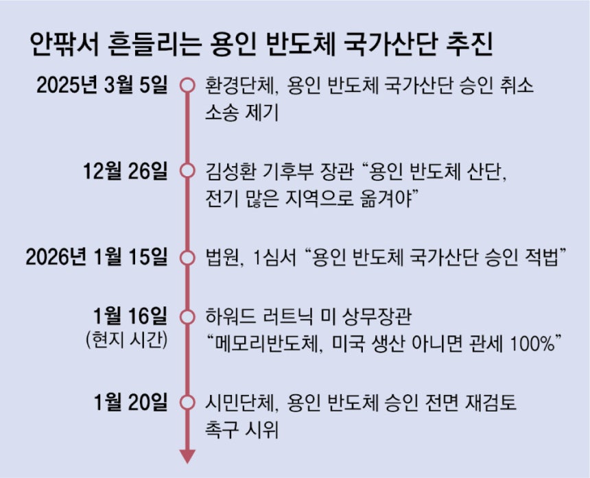 반도체 기업들이 국내에선 당초 추진하려던 산단 조성의 불확실성이 커지고 미국에선 고율 관세로 자국 투자를 압박하는‘이중고’상황에 처한 것이다.