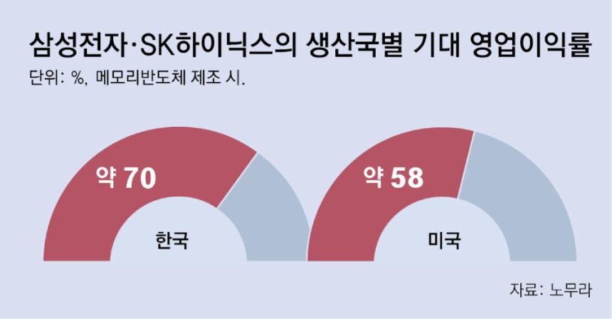 노무라증권 분석에 따르면 국내 기업이 한국에서 메모리를 생산할 경우 매출 대비 영업이익률은 약 70%에 달한다.반면 미국에서 생산하면 건설비와 인건비 상승 등의 요인으로 약 58%까지 하락할 것으로 추산된다.다만 노무라증권은 한국 반도체 기업들이 영업이익 하락에도 미국의 고관세 장벽을 피하기 위해 미국 투자에 나설 것으로 전망했다.