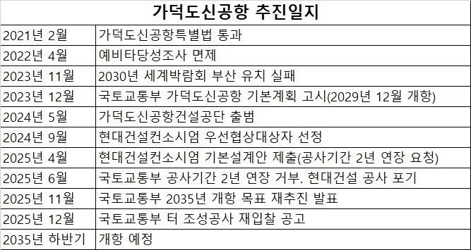 국토교통부는 네차례 입찰에서 가덕도신공항 터 조성공사 적격자가 나타나지 않자 수의계약 방식으로 전환해 2024년 9월 현대건설 컨소시엄을 우선협상대상자로 선정했다.현대건설 컨소시엄은 지난해 4월 공사 기간을 84개월에서 24개월 더 늘리는 기본설계안을 국토교통부에 제출했다.국토교통부는 불가 방침을 밝혔고 지난해 6월 현대건설 컨소시엄과‘손절’했다.국토교통부는 표류하던 가덕도신공항 터 조성공사 기간을 22개월 더 늘려서 2035년 개항을 하겠다고 밝혔다.개항 시기가 1년11개월 만에 번복됐는데 무려 6년이나 늦어진 것이다.