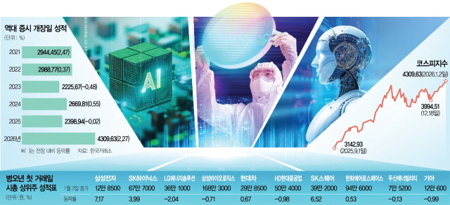 ‘병오년(丙午年)’새해 첫날부터 코스피지수가 4300을 넘어 단숨에 최고 기록을 경신한 것은 외국인이 기다렸다는 듯이 반도체 종목을 집중 순매수했기 때문이다.외국인은 2일 유가증권시장에서만 6500억 원을 순매수했는데 삼성전자(3000억 원),한미반도체(1300억 원),삼성전자우선주(730억 원),제주반도체(300억 원) 등 반도체 관련 종목만 5300억 원을 사들였다.