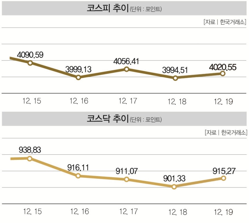 한국거래소에 따르면 코스피지수는 16일(3999.13)에 이어 18일(3994.51) 4000선 아래 떨어지며 불안한 모습을 보였다.그나마 다행스러운점은 19일 소폭의 상승세를 기록했다는 것이다.이날 코스피지수는 전 거래일 대비 0.65% 오른 4020.55로 장을 마쳤다.