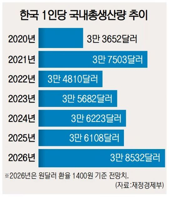새해는 정부 전망대로 경제가 성장한다면 1인당 GDP가 5년 만에 다시 3만 7000달러대로 진입할 것으로 전망된다.