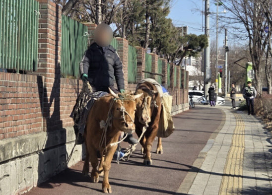 A씨는 소 한 마리에 올라탄 채 다른 한 마리를 이끌며 자신의 거주지인 수원시 장안구 상광교동에서 경찰서까지 약 5㎞를 이동한 것으로 전해졌다.
