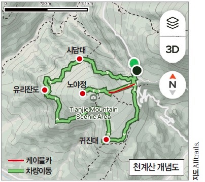 어찌됐건 케이블카와 버스 이용이 강제되면서 왕망령은 하루 종일 걸어서 돌아보지 않고 반나절 만에도 다 볼 수 있는 곳이 됐다.케이블카는 처음엔 완만하게 오르다 막판에 최고 60도로 급격히 올라 괜히 가슴이 섬찟하다.천계산에서 케이블카를 타는 곳까지 차로는 30분쯤 떨어져 있다.