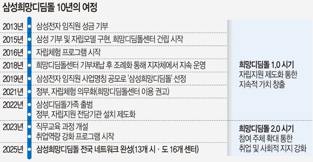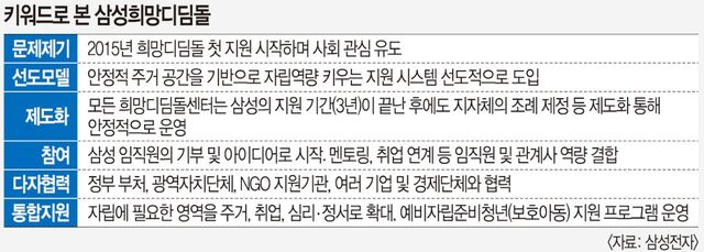 삼성희망디딤돌은 안정적 주거 지원을 제도화하는 데 초점을 맞춘‘희망디딤돌 1.0’에서 진로 탐색,취업 지원에 무게를 둔‘희망디딤돌 2.0’으로 발전해 왔다.보호시설에서 나온 청년들이 1인 1실의 개별 공간에서 길게는 2년간 머물며 자립을 준비하는 울타리 역할을 하는 희망디딤돌센터는 현재 전국 13개 지역에 16곳이 있다.센터를 이용한 누적 인원은 5만4611명에 달한다.센터에는 사회복지사와 심리상담사,직업상담사 등이 상주하며 청년들의 교육과 훈련을 돕는다.삼성은 광역자치단체별로 자립준비청년 현황과 지역 특성에 맞춘 사업을 설계해 사업계획 심의 후 3년간 센터 건립비와 운영비를 지원하고 지자체에 센터를 기부채납한다.이후 지자체가 자체 조례를 제정해 이를 근거로 예산을 지원,센터를 지속적으로 운영하는 방식이다.이렇듯 희망디딤돌센터를 통해 제시된 자립 통합지원 사업 모델은 자립체험 의무화,전담기관 설치 등 정부 제도로 정착 및 확산되고 있다.