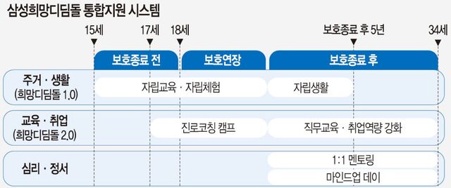 그 씨앗이 된 건 2013년 12월 고(故) 이건희 선대회장의 신경영 20주년을 기념해 삼성이 임직원들에게 지급한 특별격려금이다.임직원들은 당시 격려금의 10%를 기부하기로 했고 회사는 이를 보다 뜻깊게 사용해보자며 사내 공모를 통해 지원 사업을 모색했다.이때 선정된 사업이 아동양육시설,공동생활가정,위탁가정에서 보호받다가 만 18세가 돼 보호 조치가 종료되는 청년들을 지원하는 삼성희망디딤돌이다.희망의 디딤돌 역할을 하자는 이 명칭도 사내 공모를 통해 만들어졌다.
