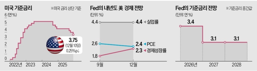 미국 중앙은행(Fed)이 10일(현지시간) 예상대로 기준금리를 0.25%포인트 인하해 연 3.5~3.75%로 낮췄다.하지만 당분간 금리 동결을 시사하고 내년 금리 인하 횟수도 한 차례에 그칠 것으로 예고해‘매파적 인하’(hawkish cut)라는 분석이 많다.