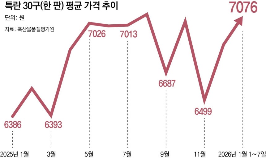 7일 축산물품질평가원에 따르면 5일 현재 특란(60∼67g) 30구(한 판) 평균 소비자 판매가격은 7045원으로집계됐다.1년전(6206원)보다 13.5% 오르면서 같은 기간 소비자물가지수 상승률(2.1%)을 크게 웃돌았다.올해 들어 평균 가격은 7081원으로 2023년(6491원),2024년(6562원)부터 지난해(6789원) 연평균 특란 한 판 가격이 6000원대였던 걸 고려하면 높은 수준이다.