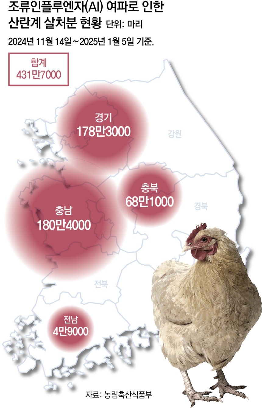 농식품부에 따르면 지난해 11월 14일 이후 올해 1월 5일까지 경기,충북,충남,전남 등 4개 시도에서 산란계 431만7000마리가 살처분됐다.산란업계는 살처분되는 산란계 마릿수가 400만 마리를 넘어가면 달걀 가격이 4∼8% 오를 수 있다고 내다본다.특히 이번에 나타난 H5N1형은 감염력이 일반 조류인플루엔자보다 10배가량 높은 것으로 전해지면서 조류인플루엔자 확산세가 커질 수 있다는 불안감이 크다.닭 사료가 되는 곡물의 수입 의존도가 높은 상황에서 원-달러 환율이 1400원대를 유지하는 점도 악재로 꼽힌다.