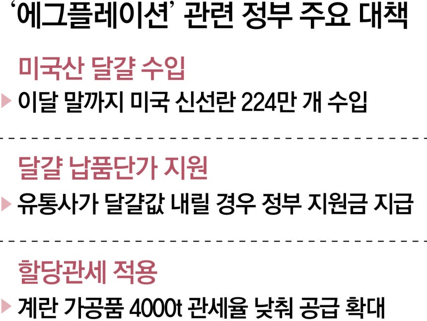 달걀 한 판 가격은 지난해 상반기(1∼6월) 4년 만에 처음으로 7000원을 넘어서며 에그플레이션 우려가 커지기 시작했다.정부는 산지 가격을 고시하는 사업자단체 대한산란계협회에 조사관 등을 보내 현장 조사를 하는 등 가격 인하에 나섰다.농림축산식품부에선 가공식품 원료육(돼지고기)과 제과·제빵용으로 사용되는 달걀 가공품에 대해 할당관세(무관세)를 적용하는 등 대책을 내놨다.지난해 11월 평균 가격은 6499원까지 떨어졌다.