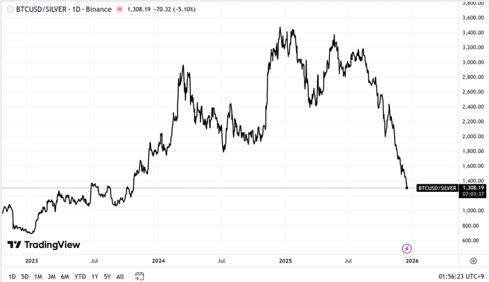 지난 1월 23일만해도 비트코인 1개로 3440트로이온스의 은을 살 수 있었는데 약 11개월만에 61.91% 급감한 셈이다.특히 비트코인이 하반기들어 크게 부진하면서 1 비트코인당 은의 양은 지난 8월 이후 4개월간 58% 감소했다.