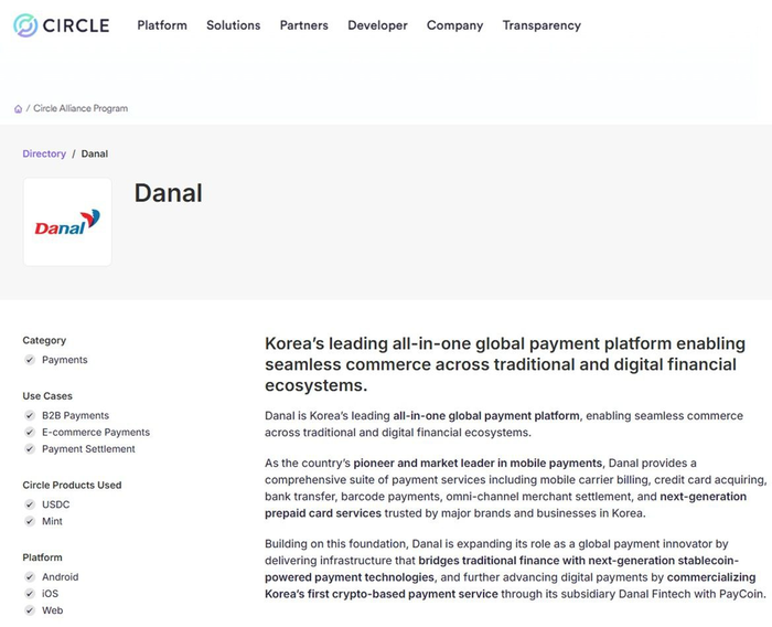다날은 최근 국내 결제사 최초 CAP로 인정받아 최종 협의를 마쳤으며,서클 공식 홈페이지에 파트너사로 등재됐다.