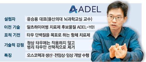 사노피가 ADEL-Y01을 높게 평가한 이유는 알츠하이머와 연관된 독성 단백질인 타우 단백질을 겨냥하는 방식에 차별성이 있기 때문이다.윤 대표는 “알츠하이머는 발병 20년 전부터 아밀로이드가 먼저 쌓이고 타우는 그보다 10년정도 늦게 축적되기 시작한다”며 “진단 시점에 아밀로이드는 이미 80% 이상 진행돼 개입 여력이 제한적인 반면 타우는 아직 절반가량만 차 있는 상태여서 치료 효과를 기대할 수 있는 여지가 더 크다”고 말했다.