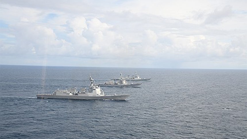 ▲ 2023년 한미일 해상 미사일 방어 훈련 당시 일본 이지스 구축함 하구로함(앞)