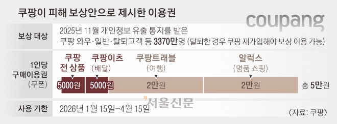 쿠팡은 이날 개인정보 유출 통지를 받은 3370만여명의 고객에게 1인당 5만원 상당의 구매이용권을 지급했다.그러나 사용처 제한과 사용 기한 설정 등 제약이 더해지면서 소비자들 사이에서는‘무늬만 5만원’이라는 비판이 나온다.