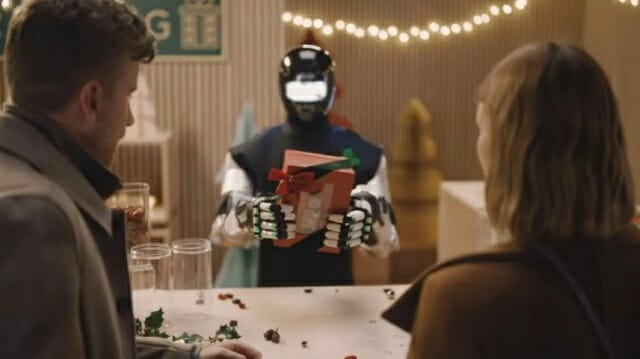 여성 고객이 “간단한 포장만 해도 될까요?”라고 묻자,로봇은 “이건 단순한 상자가 아닙니다”라고 답한 뒤 장식용 별과 솔방울,사탕 지팡이를 하나씩 더하며 과도한 포장을 이어간다.이는 영화 속에서 로완 앳킨슨이 연기한 매장 직원의 장면을 연상시키는 연출이다.