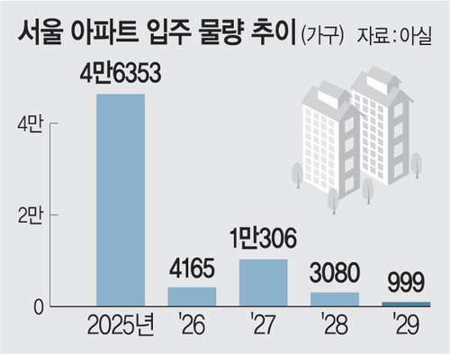 일부 중견사들은 후분양 전환까지도 논의 중이다.미분양 위험 등 시장 불확실성에 대응하기 위한 전략으로 풀이된다.부동산 빅데이터 업체 아실에 따르면 내년 서울 아파트 입주 물량은 4165가구로 추산됐다.적정 수요(4만6567가구)는 물론 올해 입주 물량인 4만6353가구의 10%에도 채 미치지 못하는 규모다.
