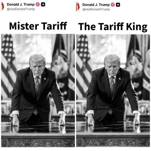 산업계 한 고위인사는 “트럼프 대통령은 철저하게 국가별 별도 합의를 추진하는 것으로 안다”며 “동맹이든 적국이든 그건 중요하지 않다”고 했다.트럼프 대통령이 덴마크령 그린란드 병합 의지를 밝히면서 유럽의 나토(NATO·북대서양조약기구) 동맹 8개국에 관세를 매기는 것도 관세 폭주의 또 다른 장면이다.트럼프 대통령은 이날 자신의 소셜미디어에‘관세 왕’(The Tariff King)‘미스터 관세’(Mister Tariff) 문구를 담은 본인 사진을 올렸다.