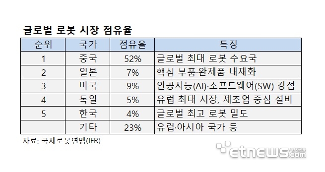 국제로봇연맹(IFR)에 따르면 2024년 기준 글로벌 산업용 로봇 신규 설치 대수는 54만2000대다.신규 설치량의 74%는 아시아에서 이뤄졌고,유럽(16%),미국(9%)이 뒤를 이었다.국가별로는 중국이 약 52%로 절반 이상을 차지했고,일본(7%),독일(5%) 순으로 나타났다.
