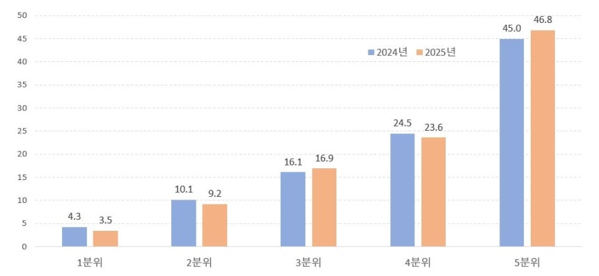 이 그림은 소득 분위별 순자산 점유율을 나타낸 것이다.2025년 3월 기준,5분위의 점유율은 47.3%다.소득 상위 20% 가구가 총자산의 47%를 소유하고 있다.전년 대비 1.3%포인트 상승한 수치다.1~4분위까지의 비율은 모두 줄어든 반면에 5분위만 늘어난 걸 알 수 있다.자산 양극화가 심화하고 있다는 뜻이다.