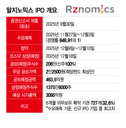 10일 코스닥 상장을 위한 일반청약을 마무리하는 알지노믹스는 오는 18일 증시에 입성할 예정이다.앞선 기관수요예측에서 희망범위 최상단인 2만2500원에 공모가를 확정한 후 848.91대1의 경쟁률을 기록하며 일반청약 흥행을 예고했다.