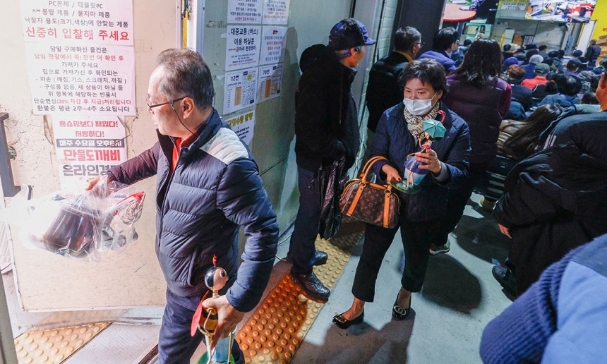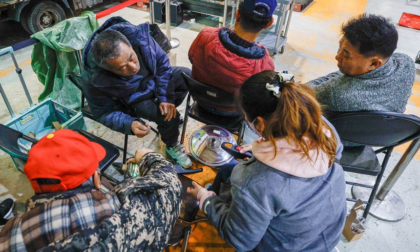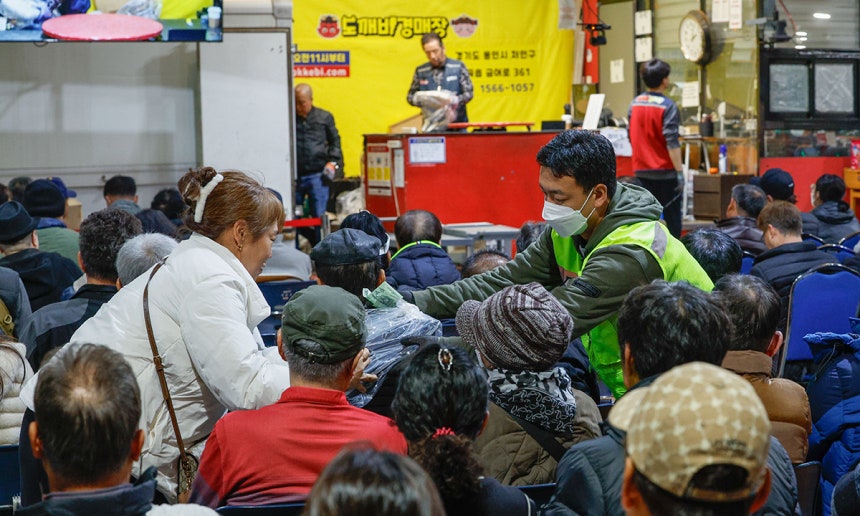 “온풍기,거의 새것이야.봐,잘 켜지잖아.이거 하나면 올겨울 얼어 죽을 일은 없어.일단 만 원부터 시작해.이만 원.아이고 두 명이네.둘이 가위바위보 해.뒤에 아줌마가 이겼네.이만 원 비싸니까 만오천 원에 줄게.”
