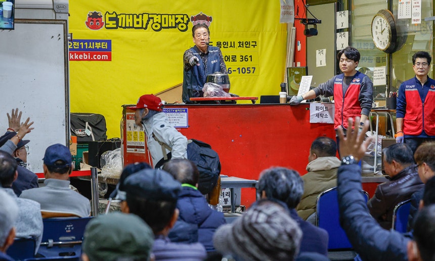 경기 용인시에 있는 만물도깨비경매장은 매일 오전 11시부터 오후 9시까지 연중무휴로 열린다.적재함을 가득 채운 1t 트럭 한 대가 들어 서면 박영걸 회장의 눈코 뜰 새 없는‘경매 쇼’가 시작된다.트럭 한 대 분량의 수많은 물품을 전부 다 팔기까지 주어지는 시간은 약 1시간에서 1시간 반.매일 엄청난 양의 물건이 들어오기 때문에 한시도 지체할 수 없다.경매사 마음대로 가격을 지정하는 것 같지만,실제로는 수십 년의 경력이 쌓인 노하우로 책정하는 가격들이다.“쉬는 날이면 대형마트나 전자상가들을 돌아다니며 물건들 가격 파악을 해요.작년에는 밥솥이 얼마였고,요즘 잘 나가는 자전거는 얼마쯤 하는지 알아야 나도 물건을 팔 수 있죠.” 속도감 있는 경매의 비결은 매일 시장 동향을 파악하는 습관에서 나온 것이다.하지만 매번 물건이 팔리진 않는다.가끔 실제 가치보다 입찰자들이 원하는 가격이 많이 낮을 때는 무료로 물건을 나눠줄 때도 있다.먼 지역에서 온 손님들이나,박 회장의 입담을 구경하러 온 노인분들에게 주로 기회가 주어진다.
