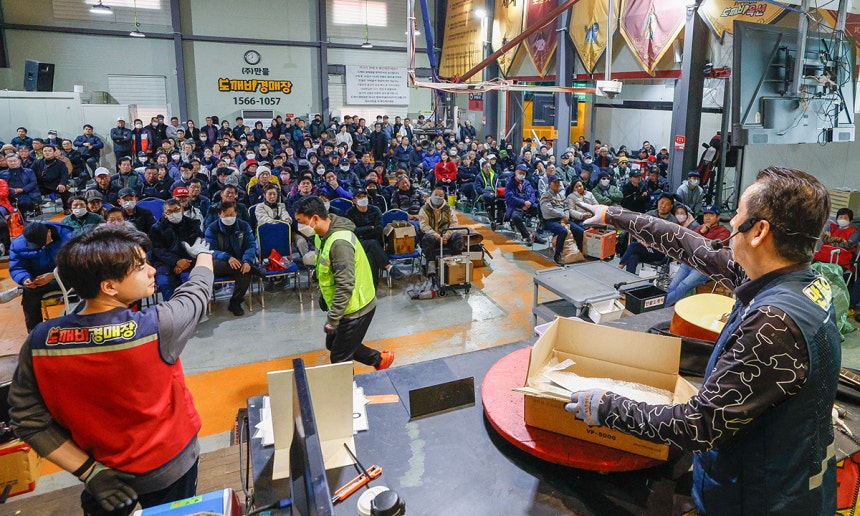 “요새 캠핑카가 잘 안 팔린다는데,그걸 전부 사다가 앞에서 고기 구워 먹을 수 있는 공간도 만들고,사람들이 와서 하루 종일 즐기다 갈 수 있는 그런 경매장을 만드는 게 제 목표입니다.” 1만 평 규모의‘경매 랜드’를 꿈꾸며 박 회장은 오늘도 마이크를 잡는다.