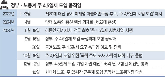 지난 대선 과정부터 한국노총과 민주노총은 주 4.5일제와 주 4일제를 요구했다.이재명 정부 출범 뒤에는 정부 회의체에 참여해 이를 이어가고 있다.양대 노총은 모두 정부가 발족한‘실노동시간 단축 로드맵 추진단’에 참여하고 있다.양대 노총은‘임금 삭감 없는’근로시간 단축을 내세웠다.다만,복귀 입플다양한 산별노조가 모여 있는 만큼,근로시간 단축 방식에 대해서는 아직까지 구체적인 방향을 내지 않았다.지난 9월 총파업을 선언했던 금융노조 등 대기업 사업장과 산별노조를 중심으로 근로시간 단축 요구가 커지고 있다.