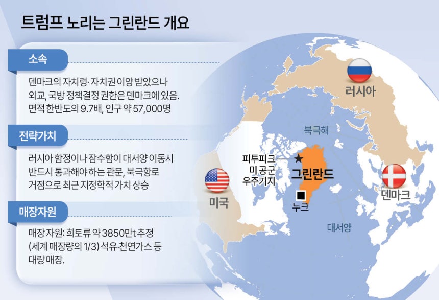 미국 트럼프 행정부가 그린란드 확보를 위한 여론 조성 작업의 일환으로,약 5만7000명에 달하는 현지 주민들에게 1인당 1만~10만달러(약 1453만~1억4530만원) 금전적 보상을 제공하는 방안을 검토중이다.트럼프 대통령의‘그린란드 확보’구상이 구체화하면서 자원과 영토를 지배하려는 트럼프식 신(新)패권주의가 본격화하고 있다는 분석이 나온다.