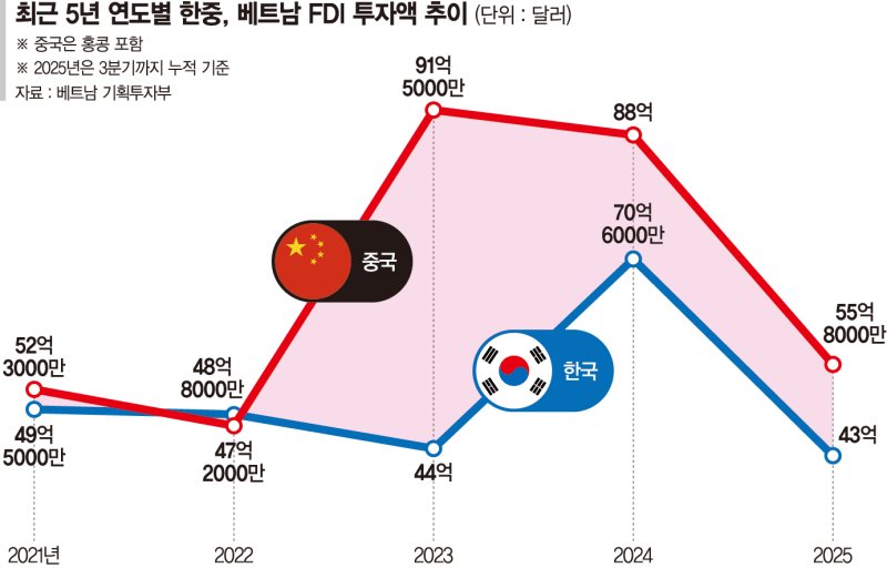 중국 기업들의 이같은 공세 배경에는 미·중 갈등에 따른 생산기지 이전이 있다.중국 내 임금 상승과 환경 규제 강화로 중저가 제조업의 경쟁력이 약화되자,중국은 생산 리스크 분산 차원에서 공급망을 해외로 이전하고 있다.중국과 인접해 기존 공급망을 유지하기 쉬운 베트남은 비교적 낮은 인건비와 젊은 노동력을 바탕으로 대체 생산기지로 부상했다.여기에 베트남이 다수의 자유무역협정(FTA)에 참여하며 미·유럽 시장 접근성이 높아진 점도 관세 리스크를 줄이려는 중국 기업들에 매력 요인으로 작용하고 있다.