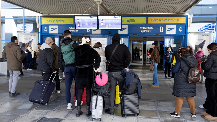 ▲ 4일(현지시간) 전면적으로 항공 교통이 중단된 가운데 그리스 아테네 국제공항 밖에서 승객들이 항공편을 확인하고 있다.