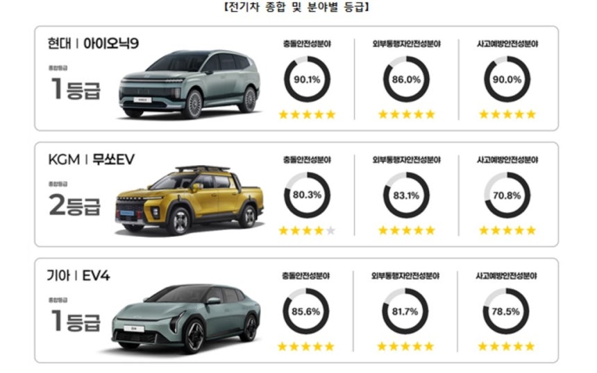 아울러 전기차에 별도로 실시하는 배터리관리시스템 안전기능 평가결과,현대 아이오닉9,KGM 무쏘EV,기아 EV4,테슬라 모델3는 별4개를,BYD 아토3는 별3개를,BMW iX2는 별2개를 획득했다.