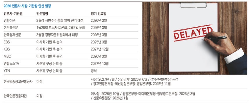 선임절차 총체적 지연경향신문,한겨레신문 등 일부 언론사가 3월 안에 새 대표이사를 선임한다.미디어 산업 전반의 위기가 심화하는 가운데 이를 해결할 적임자가 누구인지 관심이 쏠린다.반면 주요 방송사와 언론 유관기관의 사장·이사장·이사 선임은 제도적 공백과 정치 일정 지연으로 표류하고 있다.이미 임기가 만료됐거나 공석인 곳들도 수개월에서 1년이 넘도록 후임 인선 절차를 시작하지 못하며 선임 일정이 총체적으로 지연되는 상황이다.