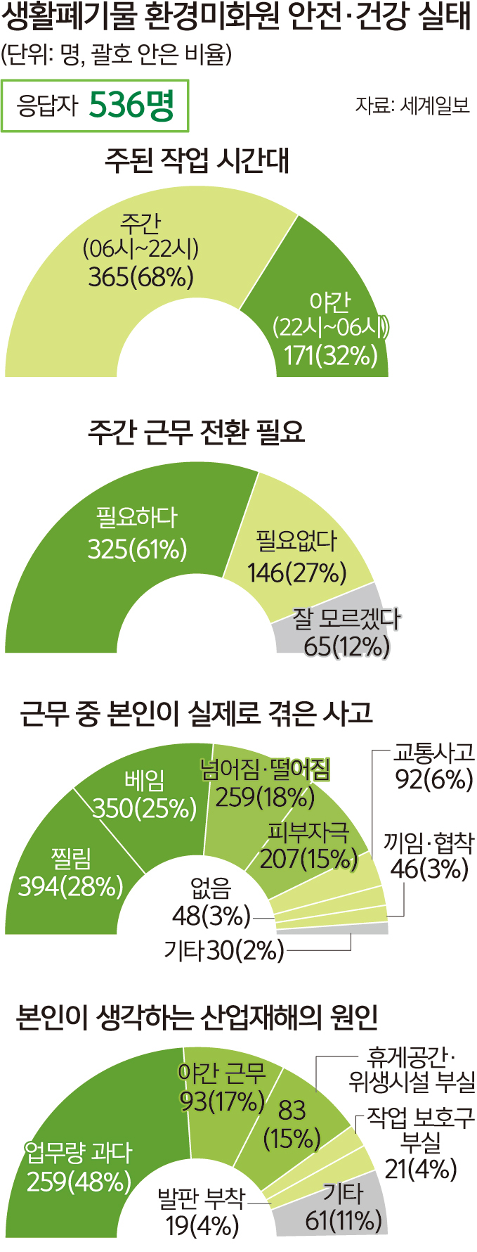 16일 세계일보의‘환경미화원 안전·건강 실태 설문조사’에서 환경미화원 10명 중 6명은 주간 근무를 선호한다고 답했다.주간 근무 전환 필요성을 묻는 항목에 전체 응답자의 61%인 325명은‘주간 근무 전환이 필요하다’고 밝혔다.27%(146명)는‘야간 근무에 문제가 없다’고 답했으며,12%(65명)는‘잘 모르겠다’고 했다.