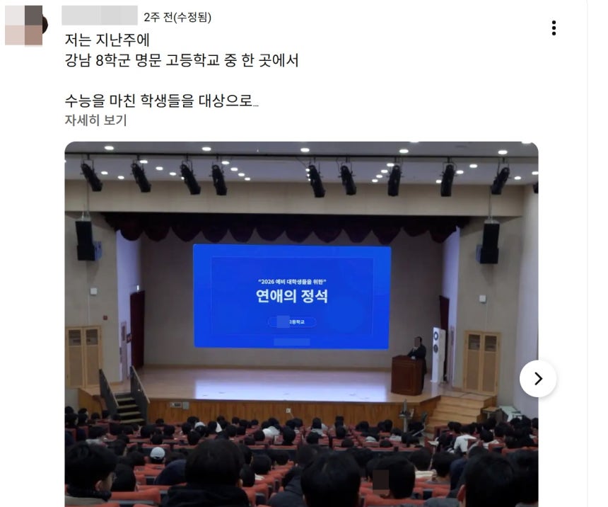 19일,<오마이뉴스>는 37만 명의 구독자가 있는 B유튜버가 최근 자신의 유튜브 채널에 올린 게시글을 살펴봤다.이 글에서 B씨는 "강남 8학군 명문고등학교 중 한 곳에서 수능을 마친 학생들을 대상으로 '2026 예비 대학생들을 위한 연애의 정석'이라는 제목의 강연을 진행했다"라면서 "그동안 다양한 곳들에서 여러 가지 주제로 강연을 해봤지만,미성년자분들을 대상으로 하는 건 처음"이라고 적었다.B씨가 A고에서 강의한 때는 11월 말이나 12월 초인 것으로 추정된다.