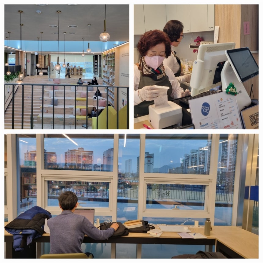 요즘 또 하나의 즐거움은 '지역 도서관'에서 시간을 보내는 일이다.읍내에서 목욕을 한 후 가까운 지역 도서관으로 향한다.도서관 1층에는 '시니어클럽'이 운영하는 카페가 있다.커피 한 잔이 2000원.카페라테와 카푸치노도 3500원이면 해결된다.남편과 둘이서 커피콩빵을 추가해도 만원을 넘지 않는다.가격도 착한 데다 한적하고 조용한 분위기를 한껏 즐길 수 있어서 정말 마음에 드는 공간이다.