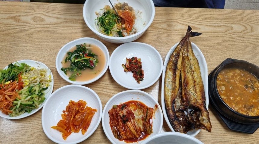 무채,애호박나물,콩나물,취나물,열무 물김치,배추 김치,된장 찌개,토토 캠프고등어구이가 푸짐하게 차려졌다.인심이 후한 아주머니는 남편은 보리밥,나에게는 흰밥을 양푼 가득 담아 주셨다.