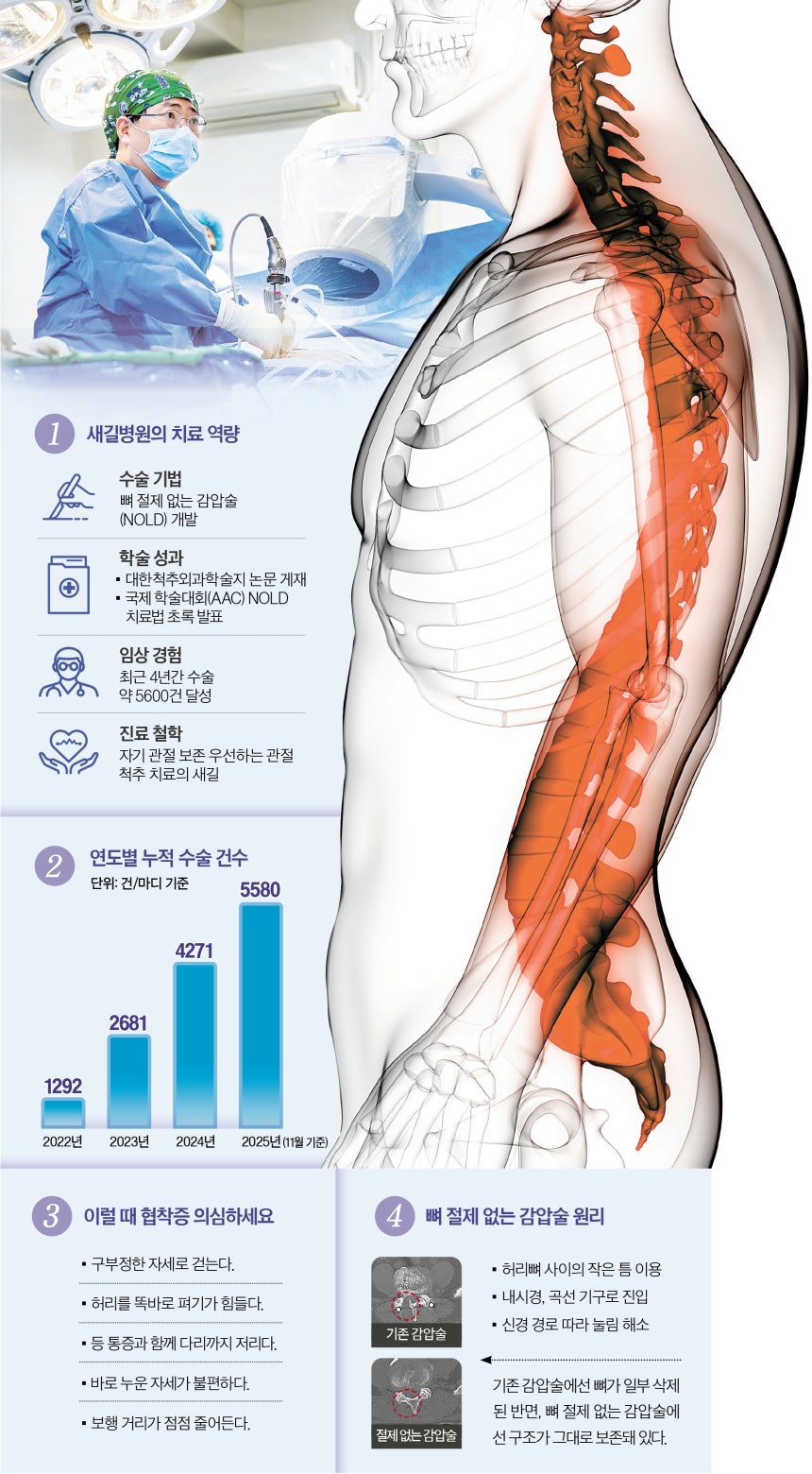 뼈 절제 없는 감압술은 고령 환자의 치료 문턱을 크게 낮췄다.최근 이 병원장은 95세 환자에게 무수면 유도 하반신 마취로 척추 세 마디의 감압술을 시행했다.일반적으로 고령 환자는 척추 한 마디를 감압하기도 어렵게 여겨진다.기존 방식이라면 3시간이 걸릴 수 있는 수술을 약 70분 만에 마쳤다.지팡이에 의존하던 80대 협착증 환자는 수술 한 달 만에 보조기 없이도 걸을 수 있게 됐다.이 병원장은 “척추 수술은 보행 능력을 지키고 수명을 늘리기 위한 치료”라며 “적절한 수술 시기를 놓치지 않는 것이 노년 건강을 좌우한다”고 말했다.