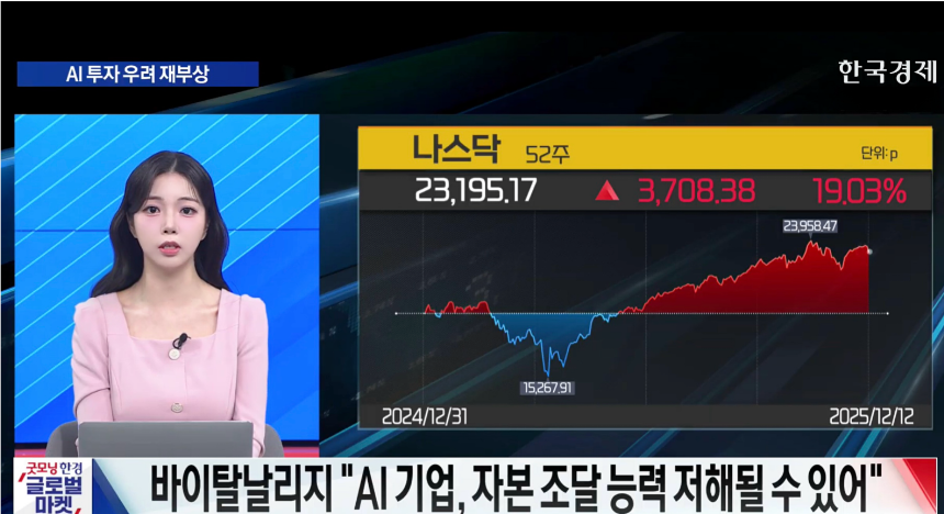 오라클에 이어 브로드컴에서도 실망감이 나타나며 AI붐에 대한 우려가 다시 커졌습니다.브로드컴의 실적 자체는 좋았지만 문제가 된 건 어닝콜 내용이었습니다.첫번째로,AI 수주 잔액이 투자자들을 실망시켰습니다.혹 탄 CEO는 “향후 6분기 동안 출하될 AI 수주 잔액은 최소730억 달러이며 시간이 지나면 늘어날 것”이라고 밝혔지만,골드만삭스는 “높은 기대를 가진 투자자들의 기대에 미치지 못 했다”고 지적했습니다.두번째로는,마진 우려가 나타났으며 혹 탄 CEO가 알파벳의 TPU 판매처가 메타 등으로 확대될 가능성과 엔비디아 GPU를 위협할 수준으로 성장할 가능성에 대해 부정적으로 언급한 점도 영향을 미쳤습니다.여기에 더해‘오라클이 오픈AI 데이터센터의 일부 완공 시점을 27년에서 28년으로 미뤘다’는 블룸버그 보도가 나오자 나스닥은 장중 한 때 2% 넘게 낙폭을 키웠습니다.다만,지연의 주요 원인은 인력과 자재 부족으로 알려졌다고 덧붙였으며 오라클 또한 모든 주요 일정이 예정대로 진행되고 있다고 반박했습니다.그럼에도 월가에서도 조심스러운 분석이 나오면서 투심은 얼어붙었습니다.요약하자면,AI 수요가 예상보다 적은 게 아니냐는 의구심이 커졌습니다.바이탈날리지는 “AI 주요 기업들은 막대한 손실 속에서 지속적인 자금 조달을 필요로 하는데 이런 상황에서 투심이 악화되면 신규 부채와 자본 조달 능력이 저해될 수 있으며 이는 결국 데이터센터 건설이 지연되는 결과를 초래할 것”이라고 지적했습니다.또한 펀드스트랫의 톰리 설립자는 “기술주는 올해 엄청난 상승세를 보여왔기 때문에 내년 초까지는 이를 소화하는 기간이 필요하다”고 전했습니다.