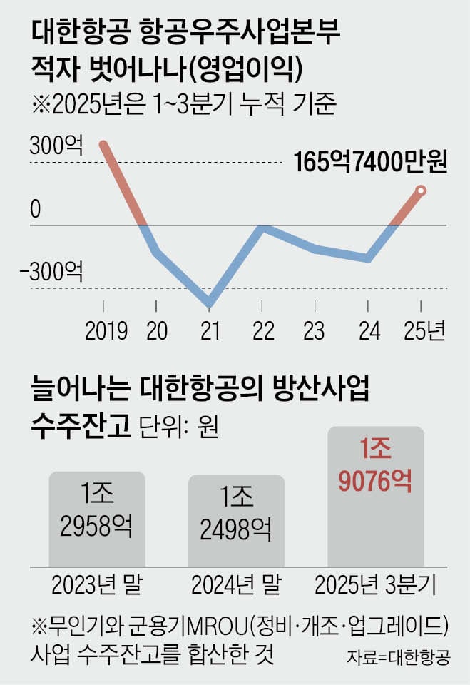 20일 업계에 따르면,대한항공 항공우주사업본부는 지난해 1~3분기 누적 매출 4713억8800만원,누적 영업이익 165억7400만원을 기록했다.4분기 잠정 실적을 합산할 경우 연간 매출은 약 7700억원에 달할 전망이다.코로나 팬데믹과 대형 수주 부재로 5년 연속 적자를 기록해왔으나,흑자 전환에 성공한 것이다.전체 매출(약 16조5000억원)에서 차지하는 비중은 아직 5% 남짓이지만,적자 고리를 끊고‘돈 버는 사업부’로 전환했다는 점이 대한항공으로선 고무적이다.