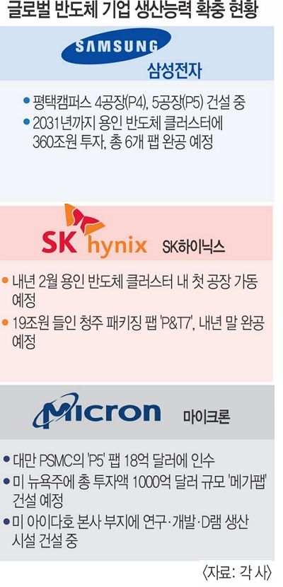 메모리 반도체 시장 1·2위를 다투는 한국 기업들도‘구조적 성장기’가 왔다고 보고,생산능력 확대에 속도를 내고 있다.삼성전자는 평택캠퍼스에서 4공장(P4)과 5공장(P5) 공사를 동시에 진행하는 중이다.특히 2028년 가동을 목표로 하는 5공장은 HBM과 범용 D램,파운드리(위탁생산)를 아우르는‘하이브리드형 메가 팹’으로 조성된다.용인 반도체 국가산단 클러스터에도 360조원을 투입해 6개의 반도체 팹을 순차적으로 완공한다는 구상이다.