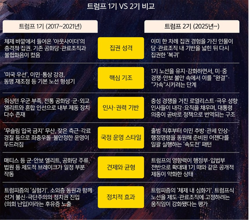트럼프 2기의 내용은 1기와 크게 다르지 않지만 운영 방식은 1기에 비해 훨씬 정교하고 공격적이라는 평가다.첫 임기 때는 워싱턴 주류 관료와 군·외교 엘리트가 곳곳에서 브레이크를 걸었다면,지금은 충성 경쟁을 거쳐 선별된 측근·극우 성향 인사들이 내각과 요직을 채우면서 대통령 의중이 곧바로 정책으로 반영되고 있기 때문이다.실제로 트럼프 2기 행정부는 출범 직후부터 이민 추방,관세 인상,행정명령을 동원한 규제 개편 등을 1기 때보다 훨씬 빠른 속도로 밀어붙였다.국토안보부와 백악관 핵심 보좌진에 이민 규제 강경파와 1기 설계자들을 다시 중용해 대규모 불법 이민자 추방작전을 컨트롤타워 차원에서 총괄하도록 한 예가 대표적이다.