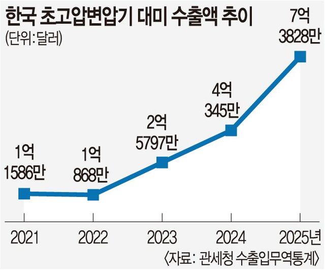 19일 관세청 수출입무역통계에 따르면 지난해 우리나라 초고압 변압기(1만㎸A 초과 기준)의 대미 수출액은 사상 최대인 7억3828만 달러(약 1조889억원)로 집계됐다.초고압 변압기의 미국 수출 규모가 1조원을 돌파한 건 처음이다.