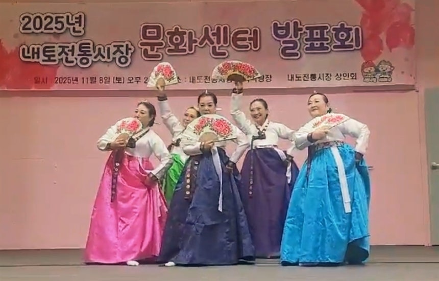 그런데 지난 2025년 11월.이 야외 무대 위에서 한국춤을 선보인 특별한 무용팀이 있다.이들은 꽃다발을 손에 들고온 어린 손자와 가족 친지들에게는 물론,장을 보러 온 관객들로부터 박수갈채를 받았다.