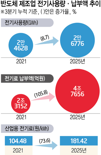 국내 반도체 제조업 전기료가 급증,제조 원가 부담이 대폭 커진 것으로 나타났다.지난 4년 사이 전기 사용량은 9% 가까이 늘었지만 전기료 납부액은 무려 2배 올랐다.